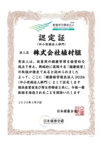 皆さんこんにちは! 植村組です。 健康経営優良法人2026 中小規模法人部門 の認定証を取得いたしましたので、お知らせいたします。