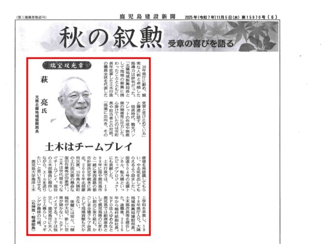この度、当社従業員が、長年にわたる業務への貢献と功績が認められ、このたびの秋の叙勲において、瑞宝双光章を受章いたしました。